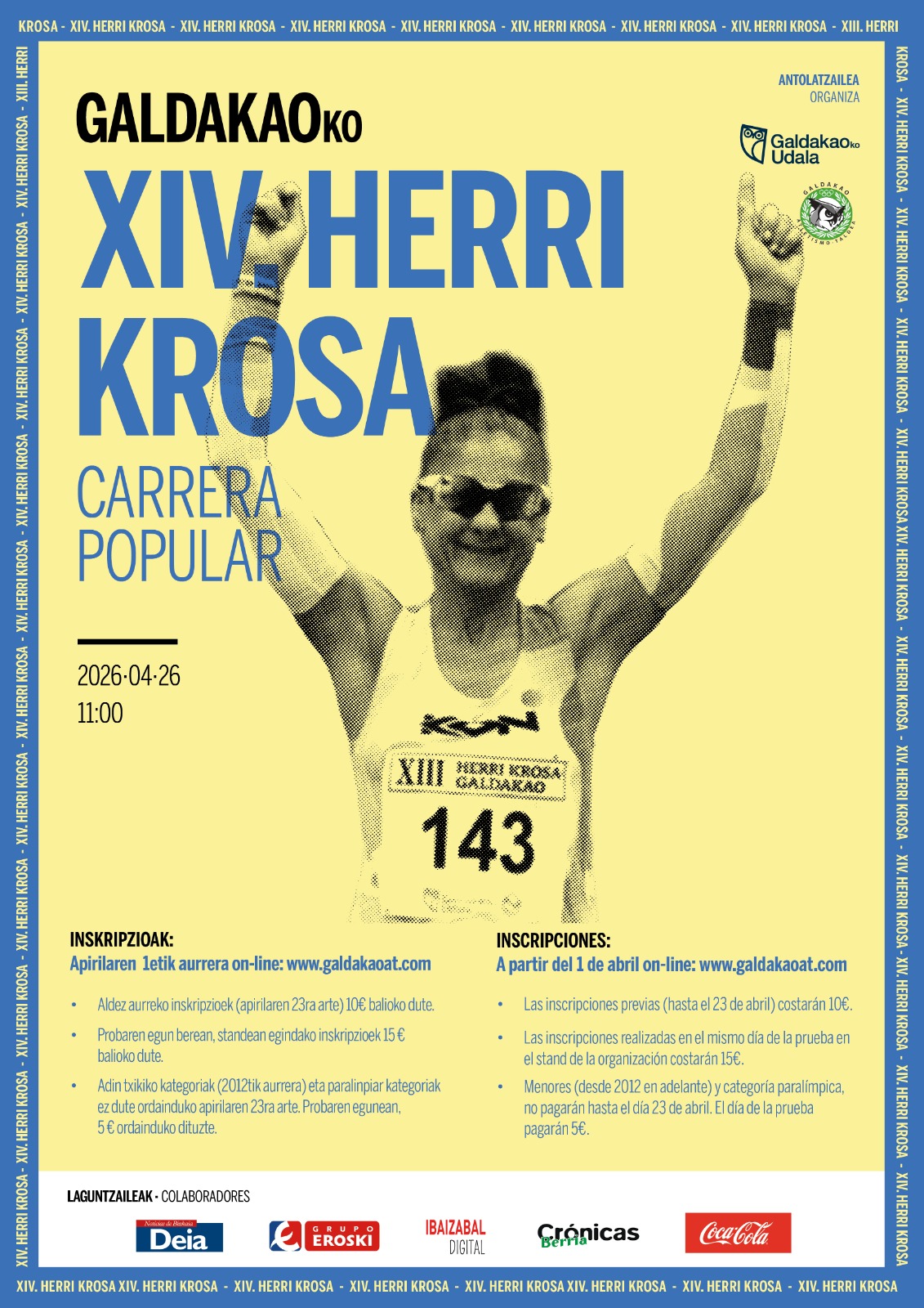 Informazio gehiago Apirilaren 26an Galdakaoko XIV. herri krosa ospatuko da 11.00 etatik aurrera. El domingo 26 de abril se celebra la Galdakaoko XIV. herri krosa a partir de las 11.00 h. Irteera eta helmuga/Salida y meta: Polideportivo Urreta....